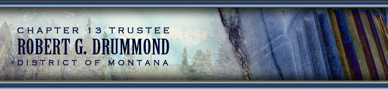 Welcome to the website of Robert G. Drummond, Standing Chapter 13 Trustee for the District of Montana.  This site can be used to assist you with a Chapter 13 case or can be used to help you access other bankruptcy information. We hope this site will foster & simplify communications between you and our office, and make available online information related to activities, services, and news of interest to the Chapter 13 Bankruptcy community.